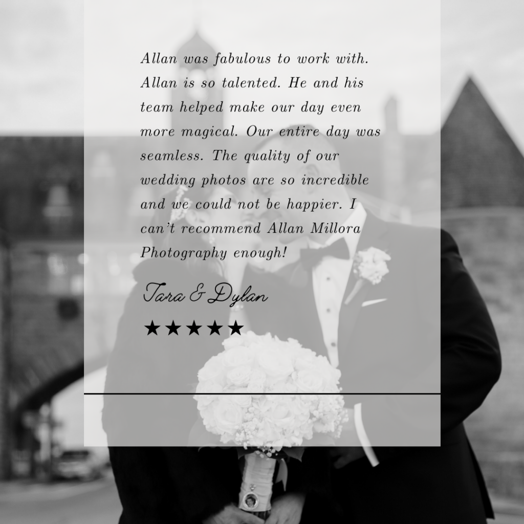 Allan was an absolute pleasure to work with. He was the first vendor we booked for our day as we loved his beautiful galleries on his website that showcased his fantastic skills. Allan shot our rehearsal dinner and wedding and made everyone feel so comfortable and welcome – he felt like family! The whole wedding party the day after the wedding kept talking about how he was the best photographer we’ve all ever worked with. He was very flexible, accommodating, and easy going. We got the photos back super quickly and they all came out absolutely beautiful. I cannot recommend Allan enough! He is simply the best. Lauren & Matthew